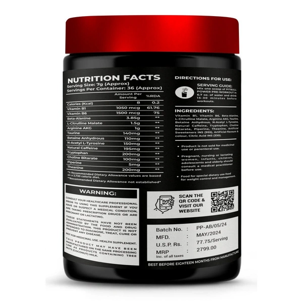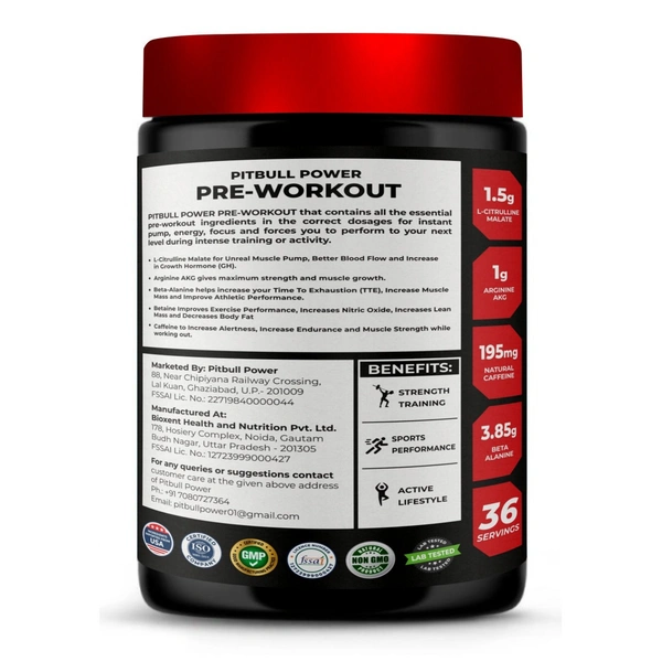 Pitbull power Pre-workout packs each serving with formulated ingredients. It ensures you receive the perfect blend for peak performance. L-Citrulline (1.5g per serving) promotes boosting nitric oxide levels, enhances blood flow, and delivers skin-splitting pumps.